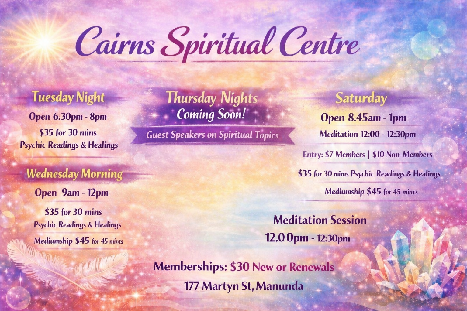 The Cairns Spiritual Centre is a welcoming community space where people can explore spirituality, healing, and personal growth through readings, healing sessions, events, and friendly connection.