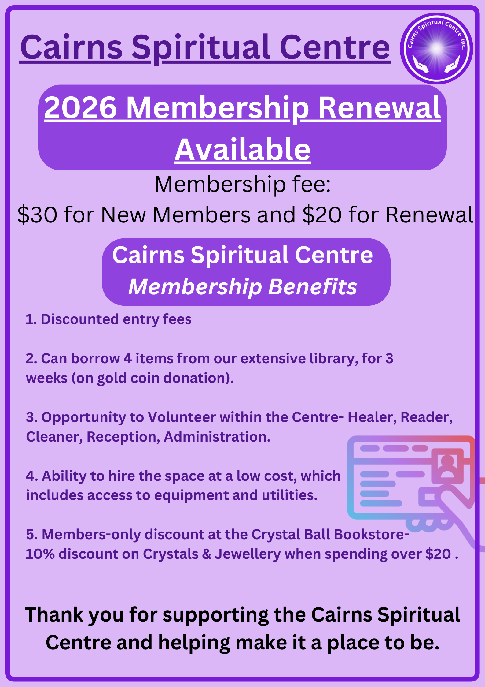 Cairns Spiritual Centre runs a weekly schedule and the kettle is always on. As we run on volunteers and go with the flow, our practitioners & services may vary on the day. Bookings are not required, just come on in. Keep an eye on our socials for anything additional offered, as there always is.